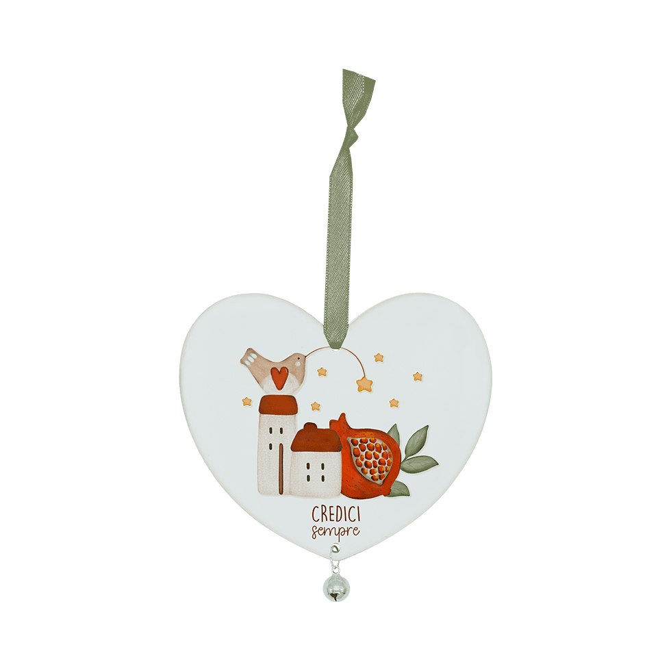 Cuore decorativo in legno laccato con stampa colorata e campanellino in metallo. Completo di nastrino per essere facilmente appeso a maniglie, pareti, alberi o dove preferisci.