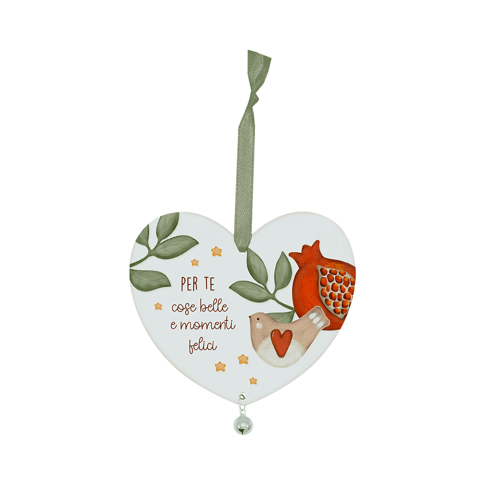 Cuore decorativo in legno laccato con stampa colorata e campanellino in metallo. Completo di nastrino per essere facilmente appeso a maniglie, pareti, alberi o dove preferisci.