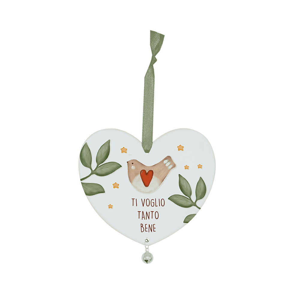 Cuore decorativo in legno laccato con stampa colorata e campanellino in metallo. Completo di nastrino per essere facilmente appeso a maniglie, pareti, alberi o dove preferisci.